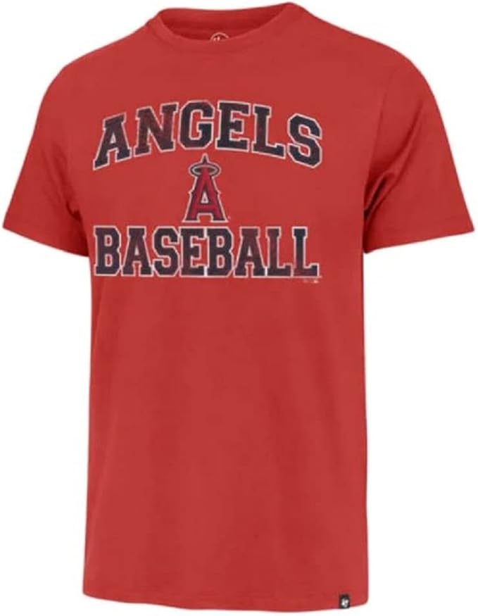 47 MLB Los Angeles Angels Men's Team Color Distressed Imprint Primary Logo Wordmark Short Sleeve Baseball T-Shirt