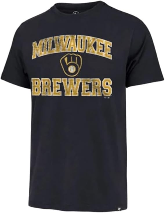 47 MLB Milwaukee Brewers Men's Team Color Distressed Imprint Primary Logo Wordmark Short Sleeve Baseball T-Shirt