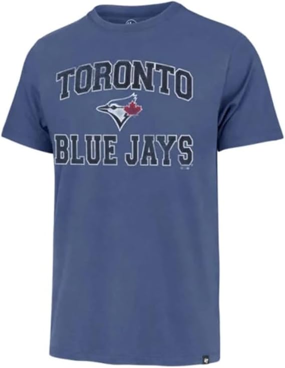 47 MLB Toronto Blue Jays Men's Team Color Distressed Imprint Primary Logo Wordmark Short Sleeve Baseball T-Shirt